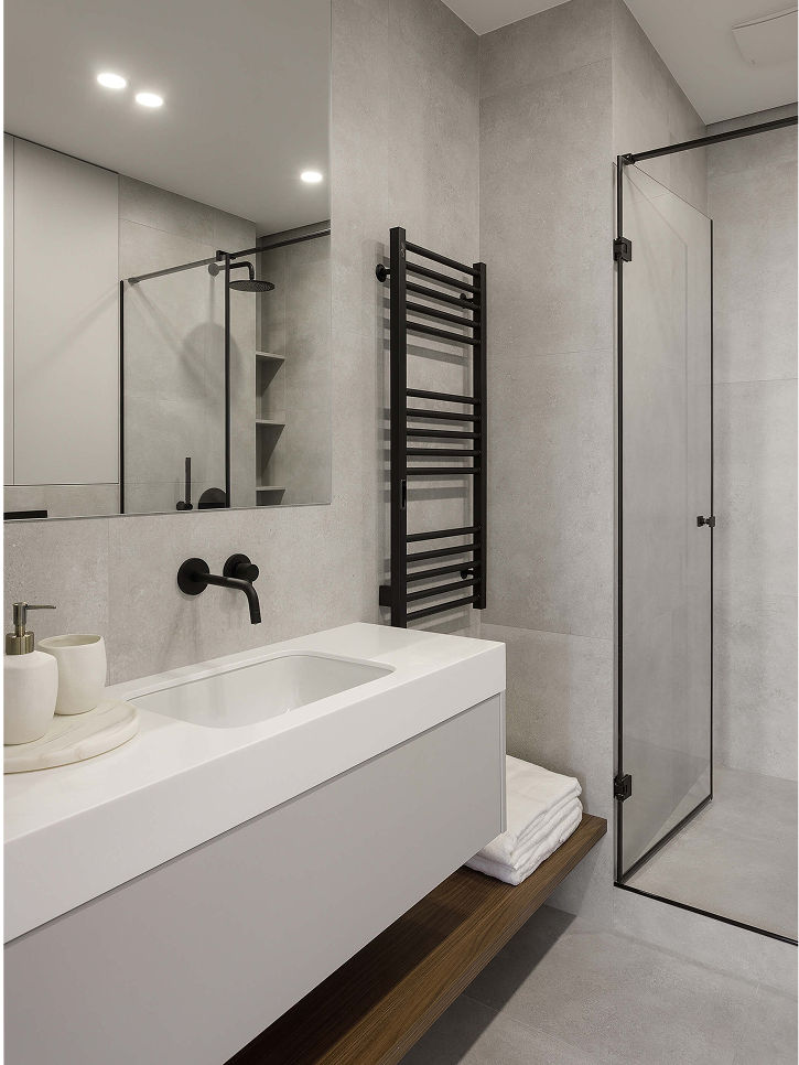 TV зона вітальні комплектована тумбою, книжковою шафою з відкритими полицями. Також дизайнер додав декоративні стінові панелі з підсвіткою, які ми виконали з фарбованого МДФ.